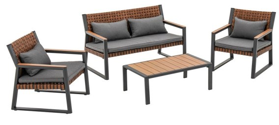 Całość utrzymana jest w eleganckim, stonowanym zestawie kolorystycznym: grafitowa konstrukcja + plecionka w odcieniu drewna + ciemnoszare poduszki.